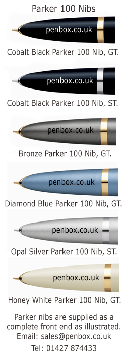 Replacement Parker 100 fountain pen nibs are now available from Penbox. They are an 18K hooded nib, supplied as a complete front end and screw directly into your existing 100 pen barrel. They are available in cobalt black with silver, cobalt black with gold trim, smoked bronze with gold trim, diamond blue with gold trim, honey white with gold trim and opal silver with silver trim. More details here or email nibs@penbox.co.uk .