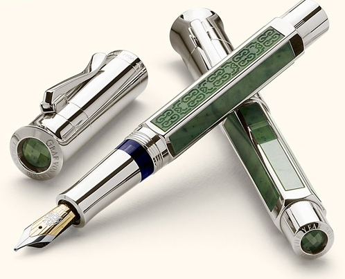 The new Graf von Faber Castell Pen of The Year 2011 is a combination of jade and platinum. In reference to the year when Faber-Castell was founded this limited edition pen is restricted to 1761 pens. The Pen of The Year 2011 uses Russian jade on the barrel and cap and is fitted with a two tone 18crt nib available in fine, medium or broad. This jewel of a pen is individually numbered and comes in a high gloss wooden case with papers. Penbox are now taking orders for The Pen of the Year 2011. Email sales@penbox.co.uk for pricing and availability.