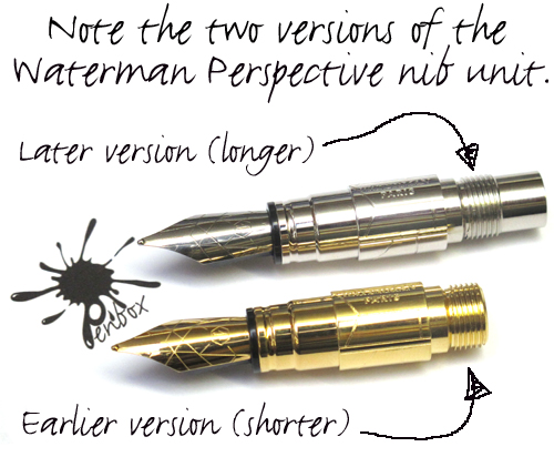 Why Waterman amended the threaded section on the Waterman Perspective nib unit we don’t know. However, we do know that the earlier version had a short threaded section and the later version has a longer (lengthened) threaded section (see the image above). This means that having ordered a Perspective nib from Penbox we will enquire with the customer to qualify which version is required. The nibs can be purchased here in both silver or gold plated finishes.