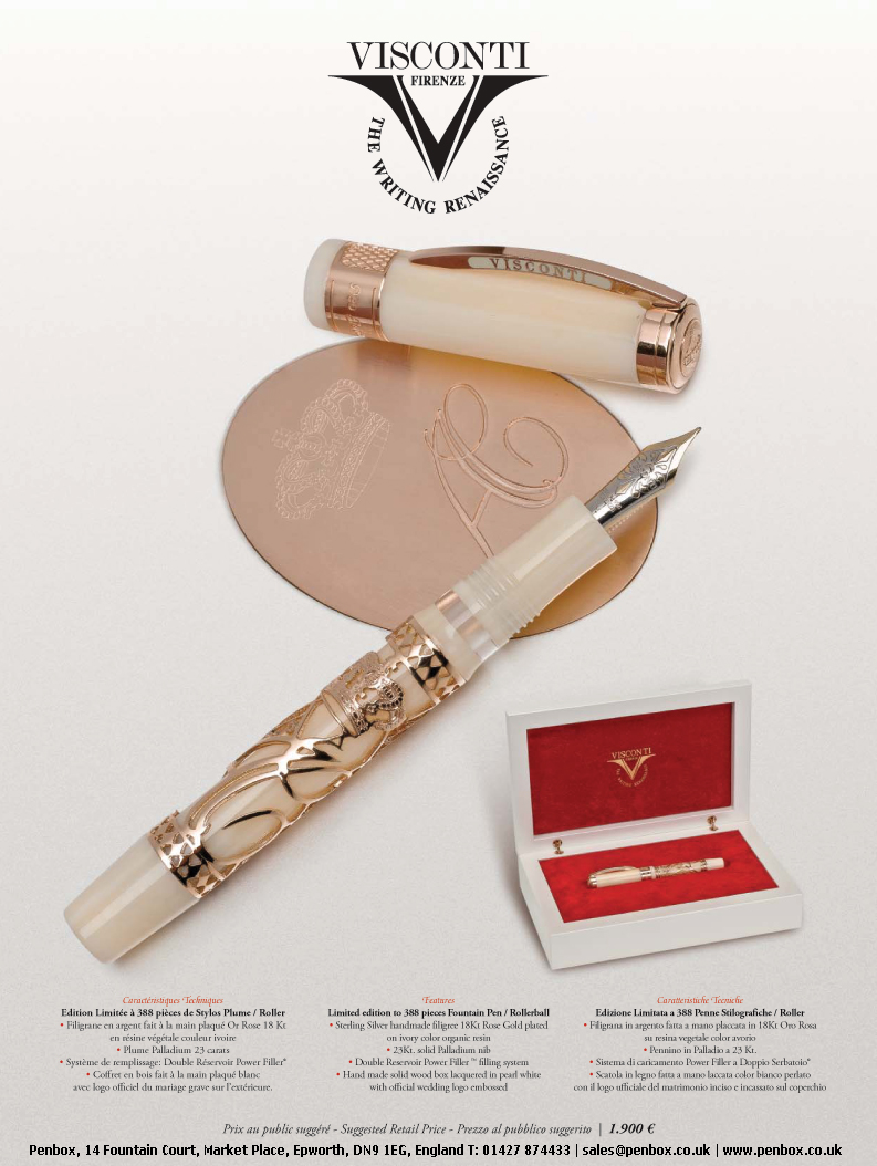 On the 1st and 2nd of July the principality of Monaco celebrated the wedding of HSH Albert II of Monaco, Sovereign Prince and Miss Charlene Wittstock. To mark this historic occasion and in a tradition of generosity characteristic of the Grimaldi dynasty, the couple agreed to the release of a limited edition fountain pen designed and hand made by Visconti, whilst understanding Visconti shall make a donation from profits to a charity chosen by the newlyweds. Contact weddingpen@penbox.co.uk for availablity of the Princely Wedding Pen.